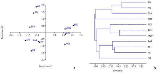 Diagrams of (a) the principal component and (b) hierarchical clustering analyses concerning the common plant taxa of the archaeological areas of the Epidaurus (EPD) and nine other archaeological areas of Greece, namely, the Akrokorinthos (AKK), Akronafplia (AKN), Monemvasia (MON), Ancient Agora of Athens (AAA), Kolona Aegina (KA), Ancient Messene (AM), Nekromanteion of Acheron (NA), Ancient Forum of Thessaloniki (AFT) and Early Christian Amfipolis (ECA).