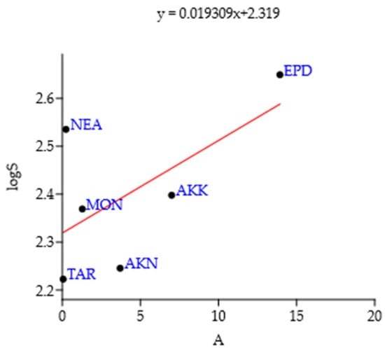 Total plant species richness–area relationship of four Greek and two Italian archaeological areas (R2 = 0.393, p < 0.5). Abbreviations: A = area, S = number of species, Epidaurus (EPD), Akrokorinthos (AKK), Akronafplia (AKN) and Monemvasia (MON), the Neapolis of Syracuse, Sicily, Italy (NEA) and the UNESCO World Heritage site of the Etruscan Necropolis of Tarquinia, Italy (TAR).