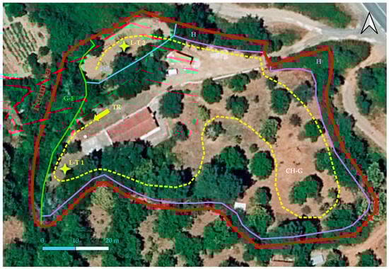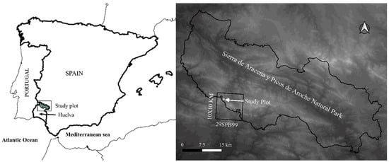 This work was carried out in a 0.5 ha plot located within the boundaries of the Sierra de Aracena y Picos de Aroche Natural Park (SW, Iberian Peninsula) (Figure 1). The plot, very representative of the protected area under study, is situated at the bottom of the valley of the Carabaña stream with a dominant NW orientation and an average slope of 20%. The average elevation is 600 m above sea level. Despite its small size, 4 different habitats can be distinguished within the plot: chestnut woodland (habitat of community interest 9260-Castanea sativa woodland), riparian woodland, orchard and hedgerows. The vegetation around the plot is typically Mediterranean. In the area surrounding the plot within a 3 km radius, 347 vascular plants belonging to 74 different families have been identified. The herbaceous stratum is the most diverse (251 species), followed by the shrub stratum (55 species) and the tree stratum (41 species). The most abundant trees are Castanea sativa Mill. and Quercus suber L., accompanied by Pinus pinaster Aiton. The shrub stratum is dominated by Arbutus unedo L., Daphne gnidium L., Erica arborea L., Genista falcata Brot., Hedera maderensis subsp. iberica McAllister, Ruscus aculeatus L., Myrtus communis L. and Viburnum tinus L. (Figure 2). Small orchards, boundary hedges and gallery forests at the bottom of valleys are also frequent [].
