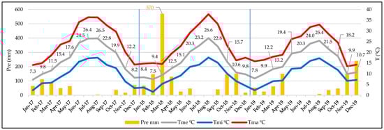 The monthly average values of Tme, Tma, Tmi and Pre are shown in Figure 3. In 2017, a total rainfall of only 557 mm was recorded, well below the annual average (≈1000 mm) [], while high summer temperatures extended well into autumn. During 2018, there was much more rainfall (1343 mm), especially in spring, with the March record being 570 mm (more than during the whole of 2017) and lower average monthly temperatures. Finally, 2019 recorded intermediate rainfall data (772 mm) and milder temperatures. All three years suffered from the dry period characteristic of the Mediterranean climate, which runs from May to September, except in 2017, during which it lasted until November. According to these data, 2017 and 2019 can be considered agroclimatically dry years (mainly 2017), although their winters were not [].