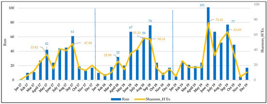 Monthly specific richness (Rsm, number of species per monthly sampling) and monthly Shannon diversity index exponential (Shannon_H’Ex) during the 2017–2019 period.