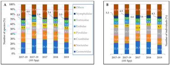 The values of abundance, species richness and number of captured specimens of the dominant species in each season are shown in Table 2. The seasonal flight pattern of the seven most representative families is shown in Figure 10. The months with the highest species richness and abundance are June (spring) and September (summer). A general decline in richness and abundance is also observed in autumn and, especially, winter (Figure 5 and Figure 6). The most representative families (Geometridae and Noctuidae) also contribute to records in autumn and winter. The rest of the families fly preferentially in summer (Crambidae, Pyralidae, Erebidae and Tortricidae) and spring (Nymphalidae). In reality, these are bimodal patterns, with maximum richness and abundance records in spring (usually June) and summer (September), with declines in July and August and, particularly, in autumn and winter. It is also noteworthy that the maximum species richness of Geometridae occurs in summer (in September, except in 2019) and abundance peaks in spring (June). On the contrary, in the rest of the families, the maximum richness and abundance occur in summer (September), except in Nymphalidae, a family that flies preferably in spring (May and June).