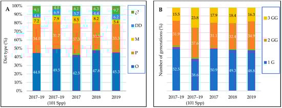 Relative distribution (%) in diet type: O, oligophagous; P, polyphagous; M, monophagous; DD, detritus; ¿?, unknown (A). Relative distribution (%) in the number of generations: 1 G, one generation; 2 GG, two generations; 3 GG, three or more than three generations each year (B).