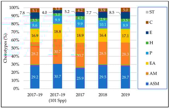 Proportion (%) in biogeography (chorotypes): ASM, Asian–Mediterranean; AM, Atlantic–Mediterranean; EA, Eurasian; P, Palaearctic; H, Holarctic; E, endemic; C, cosmopolitan; ST, subtropical.