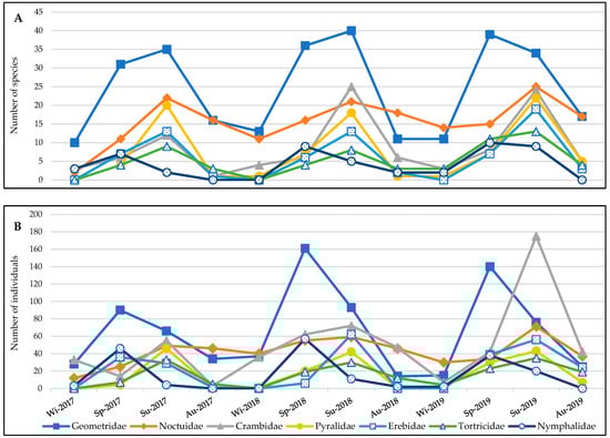 Seasonal flight of the seven most representative families—Geometridae, Noctuidae, Crambidae, Pyralidae, Erebidae, Tortricidae and Nymphalidae—during the seasons of each year: Wi, winter; Sp, spring; Su, summer; Au, autumn. (A) Number of species in each season; (B) number of individuals in each season.