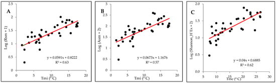 Regression between Tmi and Rsm (A), Tmi and Asm (B), and Tme and Shannon_H’Ex (C).