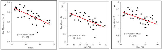 Regression between Hri and Shannon_H´Ex (A), Hrm and Rsm (B), and Hrm and Asm (C).
