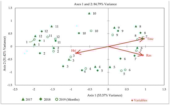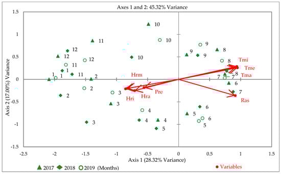 Large differences were observed in the climatic parameters across the three years studied (Table 1). The year 2017 was the warmest (monthly average maximum temperature (Tma), monthly average temperature (Tme) and monthly average minimum temperature (Tmi)) and driest (total monthly precipitation (Pre), monthly average maximum relative humidity (Hra), monthly average relative humidity (Hrm) and monthly average minimum relative humidity (Hri)). During 2018, the high rainfall led to the highest humidity records of the three years (Hrm, Hra and Hri), coinciding with the lowest temperature values (Tme and Tmi) and the lowest solar radiation record (monthly average solar radiation (Ras)). From a climatic point of view, 2019 showed intermediate values for all environmental parameters, except Ras. The monthly data for climatic parameters are shown in Supplementary Materials (Table S1).