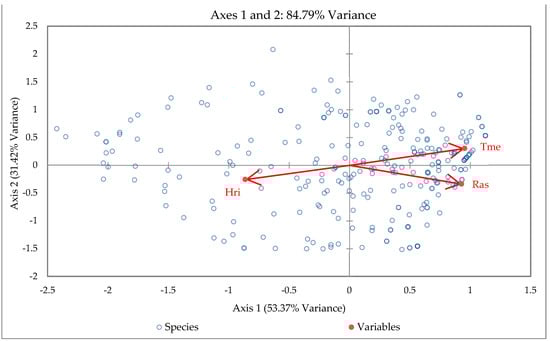 Independent CCAs were performed for monovoltine (144 species), bivoltine (97 species) and polyvoltine (42 species) species []. The results are shown in Table 4, where it can be observed that the environmental parameters (Tme, Ras and Hri) are linearly related to the distribution of the months and species in the monovoltine (V1) and bivoltine (V2) options, with a higher fit in the former. This fit (V1) is also higher than that obtained for the total species (283 spp, variables Tme, Ras and Hri) of the previous CCA.