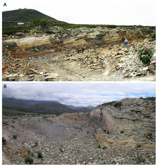 The Muhi Quarry is located outside the town of Zimapán, which is 120 km northwest of Pachuca City in the state of Hidalgo in central México (Figure 1 and Figure 2). The quarry belongs to the municipality of Zimapán and is exploited to obtain rocks that are used for construction. The outcrop consists of a sequence of biomicritic and micritic limestones, with intercalated bedded and/or nodular cherts, and laminae made of siliciclastic clay and calcium carbonate [,]. The original exposure was 7.2 m from the top to the bottom with 20 m of lateral extension, but due to the continuous quarrying, the outcrop has increased in depth by about 3 m below the floor, and most of the specimens studied here come from this segment. The lateral extension has also increased by more than 30 m. The quarrying is part of the socio-economic development of the municipality, but it has caused a major deterioration of the outcrop (Figure 1).