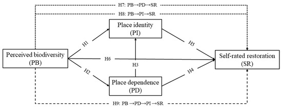 Restorative environments [42,43] refer to nature or certain specific environments that help individuals to recover from fatigue or negative emotions, and in general, green spaces are considered to be highly restorative. When an individual has a strong emotional connection with the green environment, it will effectively promote attention recovery and relaxation, contributing to the individual’s restorative perception [44,45]. Although ART proposes a mechanism of beneficial effects on public health and well-being through exposure to nature, so far, only a few studies have delved into the relationship between perceived biodiversity and restoration. For example, Carrus et al. [46] showed that increases in actual biodiversity were associated with increases in perceived restoration in the environment. Although some research has confirmed the effects of perceived biodiversity or place attachment on human emotional well-being, the interrelationships among these three factors still require further exploration [19]. Therefore, in conjunction with these analyses, the present study adopted two dimensions of place attachment (place dependence and place identity) as mediators between perceived biodiversity and self-rated restoration, leading to the subsequent hypotheses and construction of the research model (Figure 1).