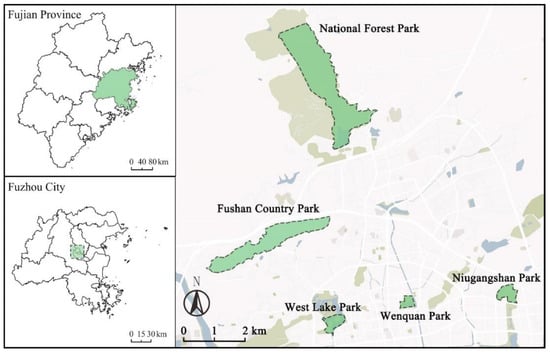 This study was conducted in Fuzhou city (latitudes 25°15′–26°39′ N and longitudes 118°08′–120°31′ E), located in southeastern China. Fuzhou is characterized by a distinctive estuarine basin landform, featuring prevalent mountains and hills [47]. The region experiences a subtropical monsoon climate, characterized by warmth and humidity, which ensures the presence of evergreen landscapes year-round. To conduct this study, we meticulously selected five representative urban parks in the main urban area of Fuzhou based on their geographical distribution, visitor traffic, and accessibility. These selected parks include Niugangshan Park, Fushan Country Park, West Lake Park, National Forest Park, and Wenquan Park, each showcasing varying scales and design themes. These parks effectively cater to the recreational, leisure, and scenic preferences of urban tourists, residents, and a diverse range of interest groups [48,49]. Their accessibility and substantial visitation rates enhance the feasibility and convenience of this research endeavor. Furthermore, the chosen parks represent common types of urban parks, and their diverse landscapes and rich biological resources provide valuable insights into the assessment of perceived biodiversity and restoration benefits (Figure 2).