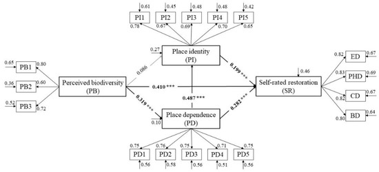 Perceived biodiversity has a direct and statistically significant impact on place dependence (β = 0.319, SE = 0.059, t = 5.879, p < 0.001) and self-rated restoration (β = 0.410, SE = 0.049, t = 8.078, p < 0.001). Additionally, there is a direct relationship between place dependence and place identity (β = 0.487, SE = 0.050, t = 9.030, p < 0.001). Similarly, place dependence (β = 0.282, SE = 0.046, t = 5.405, p < 0.001) and place identity (β = 0.199, SE = 0.049, t = 3.939, p < 0.001) have a direct impact on self-rated restoration. In summary, the analysis reveals significant differences in the two-dimensional structure of place attachment within the current model (Table 6, Figure 3).