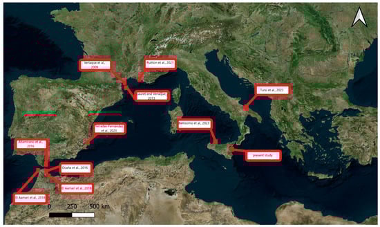 - Real, R.; Gofas, S.; Altamirano, M.; Salas, C.; Báez, J.C.; Camiñas, J.A.; García-Raso, J.E.; Gil, L.; Olivero, J.; Reina-Hervás, J.A.; et al. Biogeographical and Macroecological context of the Alborán Sea. In Alboran Sea-Ecosystems and Marine Resources; Báez, J.C., Vázquez, J.T., Camiñas, J.A., Malouli Idrissi, M., Eds.; Springer International Publishing: Cham, Switzerland, 2021; pp. 431–457. [Google Scholar] [CrossRef]