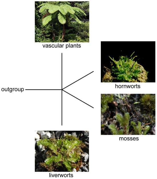 - Harris, B.J.; Clark, J.W.; Schrempf, D.; Szollosi, G.J.; Donoghue, P.C.J.; Hetherington, A.M.; Williams, T.A. Divergent evolutionary trajectories of bryophytes and tracheophytes from a complex common ancestor of land plants. Nat. Ecol. Evol. 2022, 6, 1634–1643. [Google Scholar] [CrossRef]