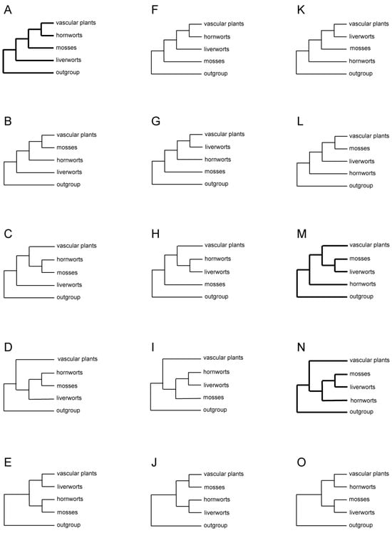 All 15 possible arrangements of three bryophyte lineages, vascular plants, and the outgroup. Three topologies commonly seen in studies of morphological and molecular data are shown in thick lines.