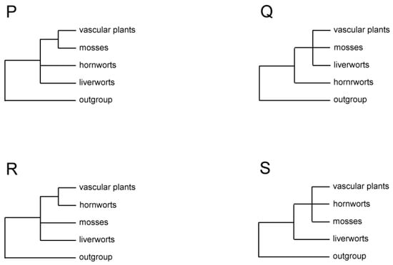 Formal phylogenetic analyses of land plants focusing on relationships among the major lineages began with cladistic analyses of mostly morphological characters in the early 1980s [3,4]. The three bryophyte lineages were found to be paraphyletic to vascular plants, but how they were related to each other and to vascular plants differed in these seminal studies. In one study, liverworts were sister to all other land plants, and mosses were sister to hornworts plus vascular plants [4] (Figure 2A, Table 1). In the other study, liverworts were sister to the rest of land plants, with hornworts sister to mosses plus vascular plants [3] (Figure 2B). Two subsequent cladistic studies of morphological data sets reached the same or similar conclusion as the latter study [19,35] (Figure 2B and Figure 3P). One of them also included well-understood extinct taxa of early land plants, such as Horneophyton and Aglaophyton, which likely represented transitional lineages between bryophytes and vascular plants [35]. However, two analyses of spermatogenesis characters both uncovered a topology showing bryophyte monophyly with hornworts sister to a clade of liverworts and mosses but with bryophytes either nested in [39] or sister to vascular plants [21] (Figure 2N). Furthermore, when some of the spermatogenesis characters were combined with developmental and morphological characters in a parsimony analysis, bryophytes were found to be paraphyletic to vascular plants, with hornworts being sister to all other land plants and a clade or grade of liverworts–mosses sister to vascular plants [21] (Figure 2M).