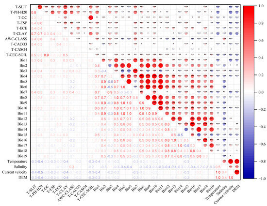 Visualization chart of correlation analysis of Barringtonia racemosa (L.) Spreng. (Lecythidaceae) environmental variables by the Pearson test. The correlation coefficient R indicates the strength of the relationship, with values above 0.7 being very close, from 0.4 to 0.7 being close, and from 0.2 to 0.4 being general. Blue represents negative correlation, red represents positive correlation, and darker colors indicate higher correlation values. * Significant correlation at 0.05 level; ** significant correlation at 0.01 level; *** was significantly correlated at 0.001 level.