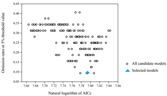 To mitigate the impact of overfitting on the model’s ability to migrate, the “Kuenm” package in R version 4.3.3 was utilized to assess the cross-combination of RM values ranging from 0 to 4, incremented by 0.5. The final model was selected based on the optimal parameter combination that yielded the smallest delta AICc value, representing the difference between the calibrated optimal model and the Akaike information criteria of the current model. This model demonstrated statistical significance, with an omission rate (OR) below 5% [57].