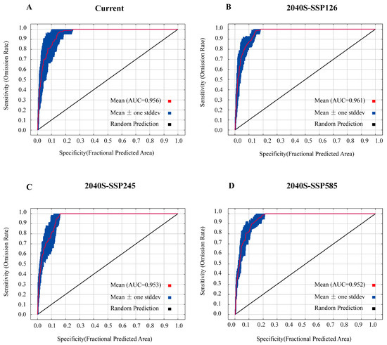 The MaxEnt simulations were conducted for both current and future (2040s) time frames under three distinct climate scenarios (SSP126, SSP245, and SSP585) using optimized parameters. The results of the simulations, as represented by the area under the receiver operating characteristic curve (AUC), are presented in Figure 4A–D, with all AUC values exceeding 0.95. These results demonstrate the exceptional predictive performance of the MaxEnt model, highlighting its high accuracy and reliability.