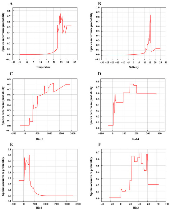 The species response curve illustrates the correlation between environmental factors and the likelihood of species occurrence, demonstrating species tolerance to environmental variables and habitat preference selection. To more accurately depict the influence of different environmental variables on the natural distribution of B. racemosa, the aforementioned variables (Temperature, Salinity, Bio18, Bio14, Bio4, and Bio3) with significant contribution rates were individually modeled as one-factor analyses. Simultaneously, the response curve depicting the relationship between the distribution probability of B. racemosa and key environmental variables is plotted based on the species’ probability of existence output by the model. Specifically, Figure 6 illustrates the response curve of six prominent environmental variables with occurrence probabilities exceeding 0.5. The threshold value of B. racemosa for each environmental variable can be determined.
