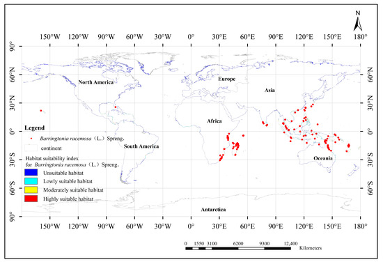 The MaxEnt model analysis has revealed that the potential distribution of B. racemosa is primarily concentrated in tropical and subtropical coastal regions near the equator, with a specific focus on regions in Africa, Asia, and Oceania. This prediction aligns closely with the known natural distribution of the species, indicating a continuous strip or band along coastal areas as the optimal habitat for B. racemosa.