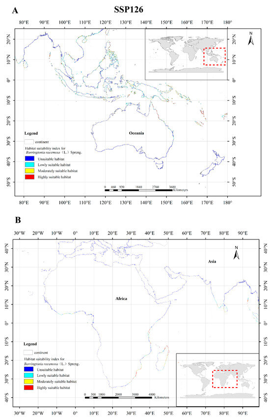 Under the SSP126 climate scenario, changes in highly suitable areas for B. racemosa were observed in various regions of Asia, particularly in the coastal areas of Hainan and southern Taiwan in China, the coastal areas of eastern Philippines, the coastal areas of East Timor, and the coastal areas of southern Indonesia (Figure 9A). The alterations in highly suitable habitats for B. racemosa in Oceania were primarily focused on the southeastern coastal regions of Papua New Guinea, the coastal areas of the Solomon Islands, the coastal regions of Vanuatu, and the northeastern coast of Australia (Figure 9A). Similarly, in Africa, the changes in highly suitable habitats for B. racemosa were concentrated along the eastern coast of Tanzania, the eastern coast of Kenya, the southeastern coast of South Africa, and the coast of Madagascar (Figure 9B).