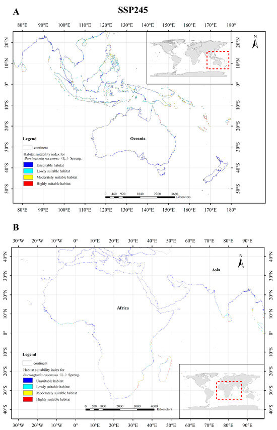 Under the SSP245 climate scenario, B. racemosa shifted to highly suitable areas in Asia, including the northern and southern coastal coasts of Taiwan and China, as well as the eastern coastal coasts of the Philippine Islands (Figure 10A). In Oceania, the plant’s suitable areas moved to the southeastern coastal coast of Papua New Guinea, the Solomian Islands, the Vanuatu Islands, the Fiji Islands, and the northeastern Islands of Australia (Figure 10A). The alterations in the distribution of highly suitable habitats for B. racemosa in Africa were primarily localized along the eastern coastal regions of Tanzania, Kenya, and South Africa, as well as the coast of Madagascar (Figure 10B).