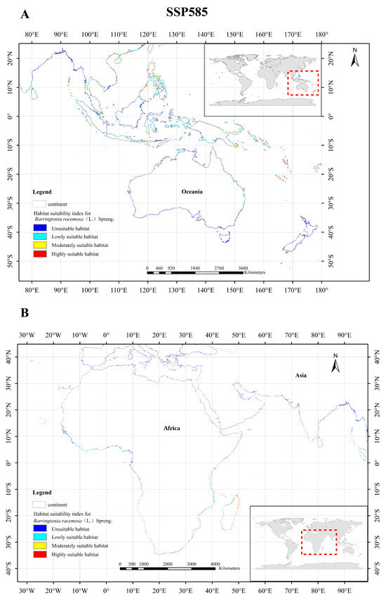 In the context of the SSP585 climate scenario, B. racemosa exhibited alterations in areas deemed highly suitable in Asia, particularly along the coastal regions of southwest Thailand, the Sumatra Islands, the eastern Philippine Islands, and the southeastern East Timor Islands (Figure 11A). Similarly, in Oceania, the changes in highly suitable areas for B. racemosa were primarily observed along the southeastern coastal regions of Papua New Guinea, the Solomian Islands, the Vanuatu Islands, and the Fiji Island, among others (Figure 11A). Barringtonia racemosa’s changes in highly suitable areas in Africa were mainly concentrated in the eastern coastal coast of Mozambique, the eastern coastal coast of Kenya, the eastern coastal coast of South Africa, and the northeastern and eastern coasts of Madagascar (Figure 11B).
