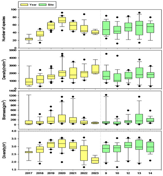 Macrobentos species number, density (ind/m2), biomass (g/m2), and diversity (H’) by year and site.