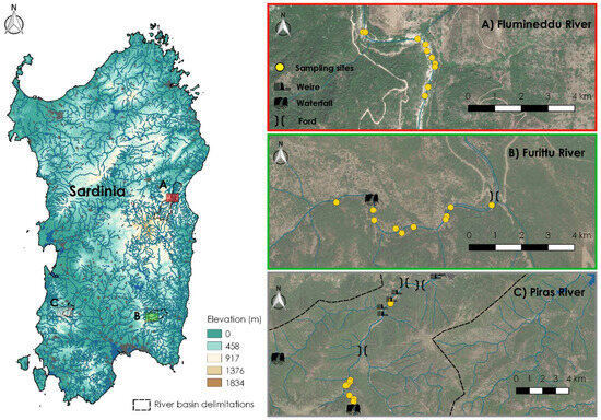 - Palmas, F.; Casula, P.; Curreli, F.; Podda, C.; Cabiddu, S.; Sabatini, A. Exploring Less Invasive Visual Surveys to Assess the Spatial Distribution of Endangered Mediterranean Trout Population in a Small Intermittent Stream. Biology 2023, 12, 1000. [Google Scholar] [CrossRef]