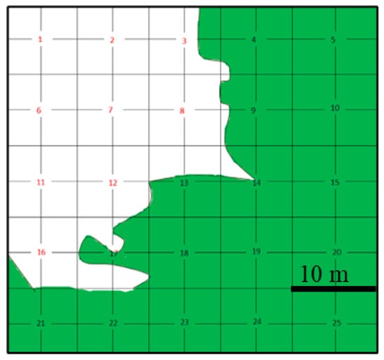 Design of the study plot. The green portion of the plot denotes the area containing dead Sasa borealis culms, and the white portion denotes the area devoid of S. borealis culms. Digits: trap points.