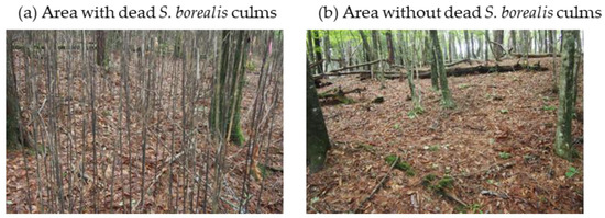 Within the study site, we established a 50 m × 50 m plot (Figure 2) comprising two areas, one of which contained a large number of dead culms (hereafter referred to as the DC area) and the other encompassing an area with no or few dead culms (hereafter referred to as the NDC area) (Figure 3). The culm density (no./m2) of the DC and NDC areas was 12.42 ± 3.99 and 0.89 ± 1.55 (mean ± SD), respectively. Within the plot, the tall tree layer comprised Castanea crenata, Quercus crispula, and Pinus densiflora, whereas Lindera triloba was the main species growing in the shrub layer. With the exception of S. borealis, the understory vegetation was comparatively sparse. Moreover, we did not find any live S. borealis specimens within or surrounding the plot.