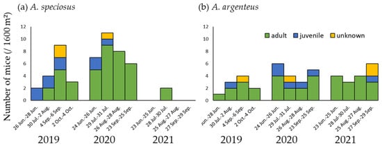 Fluctuations in rodent populations are closely associated with the abundance of food [32,33]. In the case of A. speciosus, it has been established that population size is significantly influenced by the production of Q. crispula acorns [34], which is a source of food exclusively consumed by A. speciosus given the tolerance of these mice to the tannins contained within these acorns [35]. Consequently, it can be speculated that a poor Q. crispula acorn crop in 2020 contributed to a decline in the A. speciosus population in 2021; however, given the lack of data on acorn production within the study area, we are unable to confirm this conjecture.