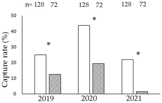 Relationships between the presence or absence of dead Sasa borealis culms and the rate of wood mouse capture. Open bars: area with dead S. borealis culms (DC). Shaded bars: area lacking dead S. borealis culms (NDC). The numbers (n) on the top are sample size (trap nights). Asterisks (*) indicate significant differences between the DC and NDC areas.