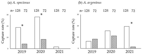 Relationships between presence or absence of dead Sasa borealis culms and the rate of (a) A. speciosus and (b) A. argenteus capture. Open bars: area with dead S. borealis culms (DC). Shaded bars: area without dead S. borealis culms (NDC). The numbers (n) on the top are sample size (trap nights). Asterisks (*) indicate significant differences between the DC and NDC areas.