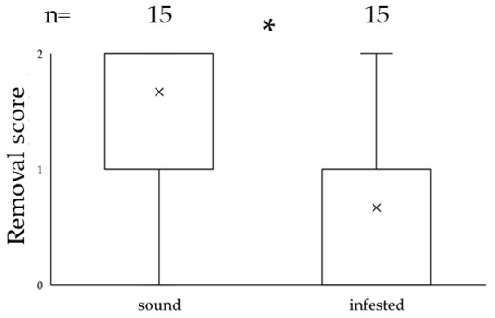 A comparison of the removal scores recorded for sound and infested (moth larvae) Castanea crenata acorns in area with dead Sasa borealis culms. The numbers (n) on the top are sample size (trials). The asterisk (*) indicates a significant difference in the removal score between sound and previously infested acorns.