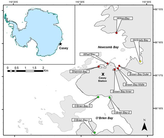 Casey Station is situated at 66°17′ S, 110°32′ E on the Bailey Peninsula in the Windmill Islands, East Antarctica (Figure 1). The shallow benthic marine environment (<50 m) near the coast at Casey is heterogeneous in terms of sediments, which encompass various sizes of grains, gravels, stones, boulders, and bedrock []. All locations exhibit relatively similar sea ice regimes, although considerable local variation exists in the timing of ice breakup and the duration of open water periods. The bathymetry within the two large bays under study (Newcomb and O’Brien, see Figure 1) is comparable, featuring deep basins reaching depths of 90 m and small bays along the edges typically reaching maximum depths of 25 to 30 m, where the samples were collected. Despite limited knowledge about the oceanographic patterns at the site, all bays in this study experience similar tidal and oceanographic regimes.