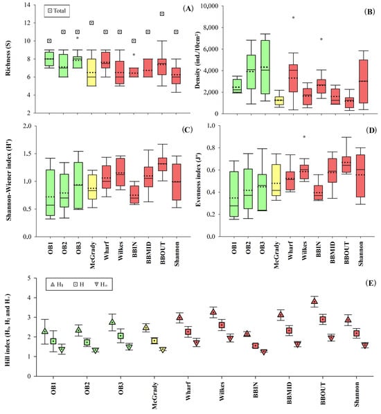 Richness (A), density (B), Shannon–Wiener index (C), evenness index (D) and Hill’s index (E) of meiofauna recorded at each location (OB1, OB2, OB3, McGrady, Wharf, Wilkes, BBIN, BBMID, BBOUT, and Shannon). The solid horizontal line indicates the median and the dotted horizontal line indicates the mean. Boxes represent upper/lower quartiles. The vertical lines extending from each box represent the minimum and maximum value. The colors indicate the impacts in relation to locations, where red (