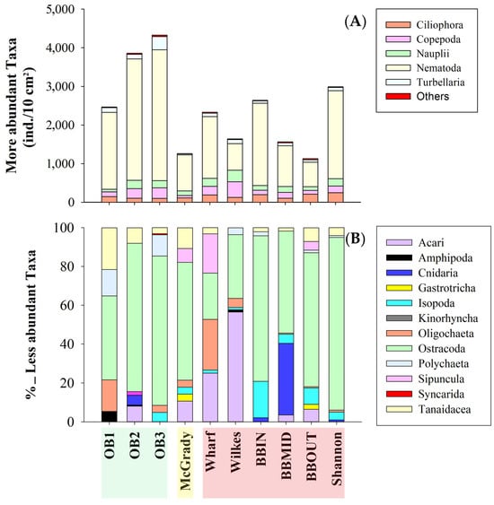 Proportion of the average composition of ciliophores and most abundant meiofauna taxa (A) and relative abundance (%) of the least abundant (<1%) meiofauna taxa (B) found at each location (OB1, OB2, OB3, McGrady, Wharf, Wilkes, BBIN, BBMID, BBOUT, and Shannon). The colors in locations indicate the impacts in relation to locations, where “light red” are impacted locations, belonging to Newcomb Bay, “light yellow” is the reference location belonging to Newcomb Bay, and “light green” are reference locations belonging to O’Brien Bay.
