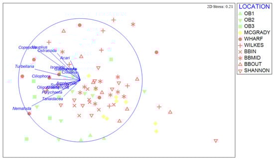 A multivariate analysis of meiofauna community composition revealed significant differences at the location scale, with significant variation only observed among locations (Table 2). The nMDS ordinations showed a greater association and less dispersion between the impacted locations (BBIN, BBMID, BBOUT, and SH) compared to the others (Figure 4). The Spearman correlation vectors applied to the nMDS indicated that most taxa exhibited a positive correlation with the reference locations belonging to OB (particularly OB1 and OB2) as well as WH. This is consistent with the observation of the highest meiofauna densities at these locations. Further analysis of community structure was conducted using PERMDISP, which tests for differences in multivariate dispersion. No significant differences in the multivariate dispersion for meiofauna communities among locations were found (p = 0.19).