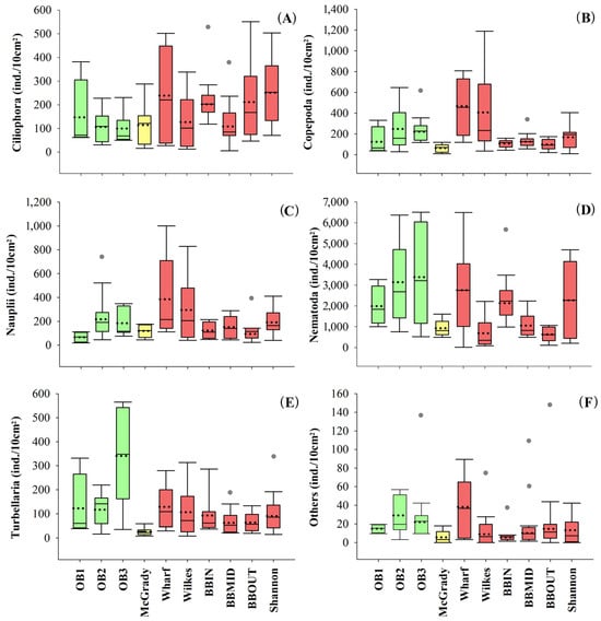 ) are reference locations belonging to O’Brien Bay. The vertical lines extending from each box represent the minimum and maximum value. Star-shaped symbols (●) indicate outliers. (A) Ciliophora, (B) Copepoda, (C) Nauplii, (D) Nematoda, (E) Turbellaria, and (F) others taxa.