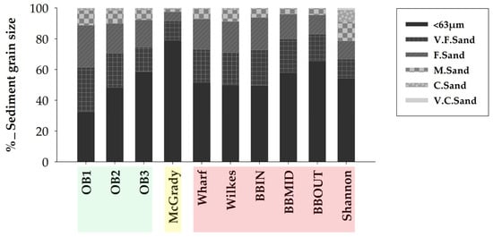 Proportion of average composition of sediment grain sizes found at each location (OB1, OB2, OB3, McGrady, Wharf, Wilkes, BBIN, BBMID, BBOUT, and Shannon). The colors in locations indicate the impacts in relation to locations, where “light red” are impacted locations, belonging to Newcomb Bay, “light yellow” is the reference location belonging to Newcomb Bay, and “light green” are reference locations belonging to O’Brien Bay.