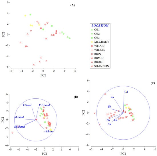 When separating the grain size and metal variables, these patterns changed slightly, with fewer differences between localities, particularly in grain size. A prevalence of smaller grains is observed in the locations, with a difference between <63 and V.F. sand in PC2, where the locations OB1, OB2, WH, WI, and BBIN are correlated with V.F. sand, while OB3, MCG, SH, BBMID, and OUT are correlated with <63 m (Figure 7B). For metal concentrations, the impacted locations of BB form a highly variable group on their own, and the rest of the locations form a grouping together (Figure 7B). Both sampling locations in BB (BBIN, BBMID, and BBOUT) were clearly separate from the other locations in the PCA ordination, with particularly high concentrations of tin, copper, and lead (Figure 7C).