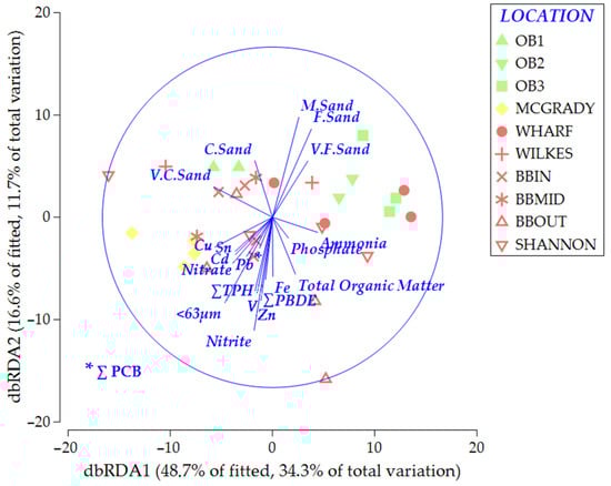 Among the persistent organic pollutants, total petroleum hydrocarbons (TPH), polybrominated diphenyl ethers (PBDEs), and polychlorinated biphenyls (PCBs) were identified, with TPHs and PCBs showing significant differences between study locations (p ≤ 0.01). The highest average concentration of TPH was found in BBIN, at 241.43 mg/kg, while OB1, OB2, WH, and WI showed concentrations below the detection level (35 mg/kg) (Table S4). The average PBDE concentration ranged from 1.35 ng/kg in OB3 to 23.09 ng/kg in Shannon (Table S4). PCBs were only found in impacted locations, with a higher average concentration of 252.25 ng/kg in BBIN (Table S4).