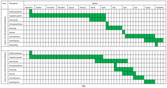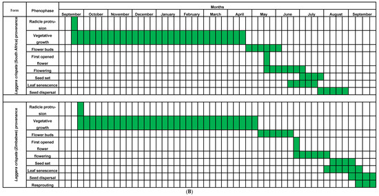 Phenophases of studied Laggera alata (A) and Laggera crispata (B) forms. The color-shaded rows indicate the whole period of appearance of different phenophases.