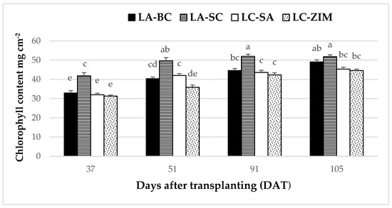 In the present study, LA-SC leaves had the highest chlorophyll content at 37, 51, and 91 DAT compared with the other forms, and it ranged from 41.86 to 51.97 mg cm−2. A comparable study in Iran reported a leaf chlorophyll content of 0.063 mg/L for an Asteraceae perennial herb [60]. Similarly, the average total chlorophyll content of 10 medicinal plants from the Asteraceae family recorded a chlorophyll content of 8.61 mg/g [61]. The present study used a non-destructive method, compared with the destructive extraction method used in the other two studies, hence the noted significant difference between the three [62]. The variation in leaf chlorophyll content in the current study might also have been caused by atmospheric and soil factors [44], because chlorophyll synthesis requires various elements, such as nitrogen and phosphorous, from the soil [63].