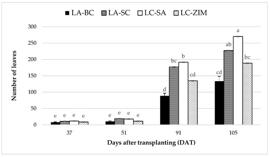 The interaction between DAT and Laggera forms had a significant effect on the number of leaves per plant (Table S5). The variation in the number of leaves per plant emerged from 91 DAT, with LC-SA producing more leaves than LA-BC (Figure 4). Again, LC-SA produced the most leaves at 105 DAT, while LA-BC produced the fewest leaves. The maximum number of leaves was produced at 91 DAT for LA-BC, LA-SH, and LC-ZIM. A consistent increase in the number of leaves per plant was recorded for all Laggera forms (Figure S5).
