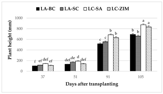 Plant height significantly differed among Laggera forms (Table S7). Plant height drastically increased from 91 DAT for all forms, compared with 37 and 51 DAT (Figure 5). The plant heights of LA-SC and LA-BC forms were significantly similar at 105 DAT, as were those of LC-SA and LC-ZIM forms. Laggera crispata forms had significantly taller plants, reaching the heights of 874.6 and 833.3 mm, respectively, whereas Laggera alata forms had shorter plants, reaching 692.4 and 662.2 mm, respectively. The linear regression analysis for plant height over days after transplanting showed a significant positive correlation for all Laggera forms studied (Figure S7).