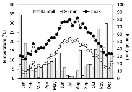 Air minimum and maximum temperatures and rainfall recorded at the experimental site over the years 2021, 2022, and 2023. Temperature values are 10-day averages. Rainfall bars represent 10-day sums.